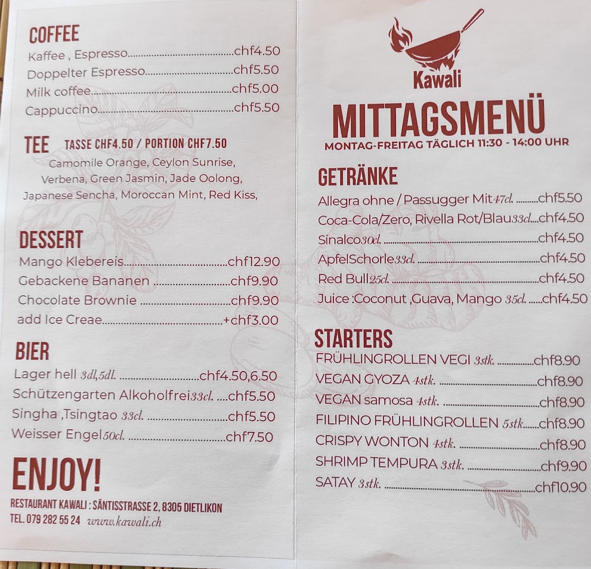 Welcome to Kawali Asian Restaurant, an exceptional culinary destination located at Säntisstrasse 2, 8305 Dietlikon, Switzerland. This charming venue masterfully blends Filipino and Thai cuisine, offering diners a taste of authentic flavors that transport you straight to Asia.